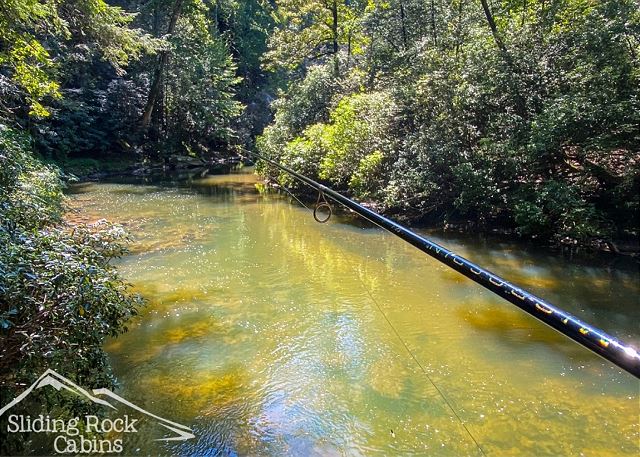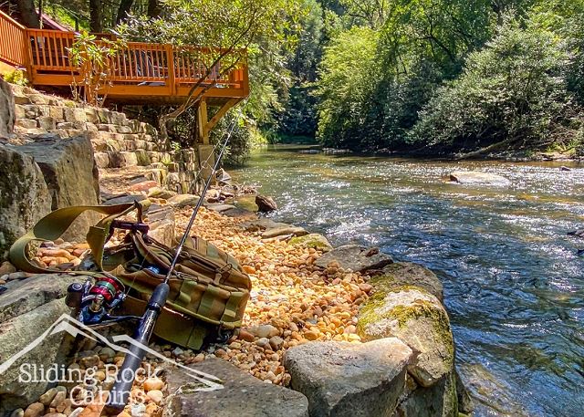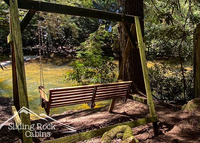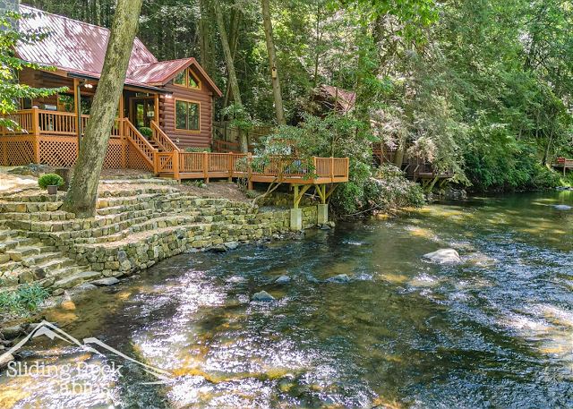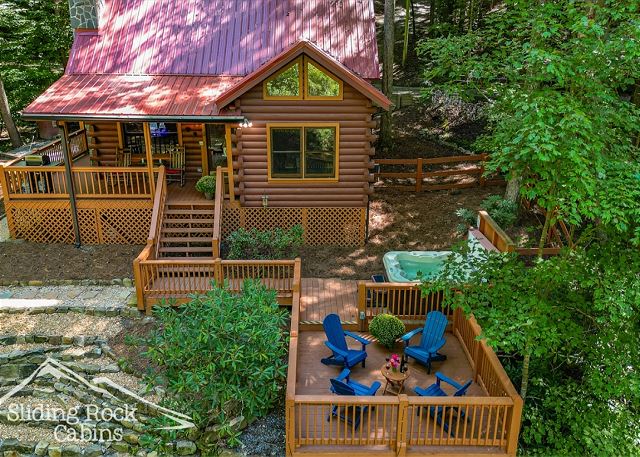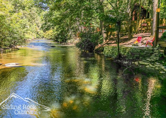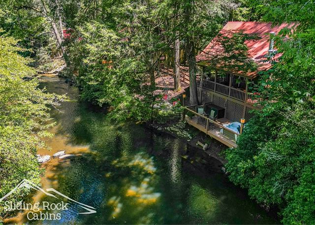 River Rock is a full log home with deck hanging right over the ELLIJAY RIVER. It offers several decks with a large hot tub, gas grill, FENCED yard (dog friendly), and direct river access. As one of Sliding Rock Cabins' river fronting properties you can fish in comfort with a deck hanging over the river. Or maybe hike the Ellijay and Blue Ridge's mountain trails, try your hand at fly fishing, then in the evening watch the river flow by, or cuddle up next to the gas log fireplace and watch an old movie on your large screen TV, maybe sleep in late on the King Size bed in the loft and have coffee on the Juliette balcony.