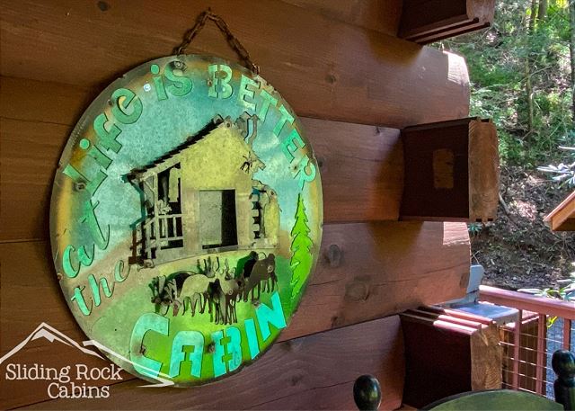 Main floor has one king-size bed, a bath with shower and tub combination. Upstairs, the spacious, open loft has a King-Size bed with private bathroom. This bathroom has a garden tub (no shower). River Rock is is a perfect getaway for up to Four Adults. This Sliding Rock Cabin is an ADULT ONLY cabin (no guests under age 25).